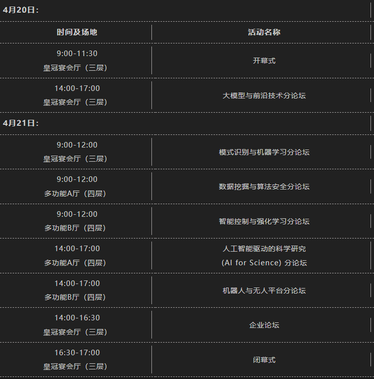 本届论坛共设立7场分论坛,包括:大模型与前沿技术、模式识别与机器学习、数据挖掘与算法安全、智能控制与强化学习、人工智能驱动的科学研究(AI for Science)、机器人与无人平台、企业论坛。详细论坛日程如下: