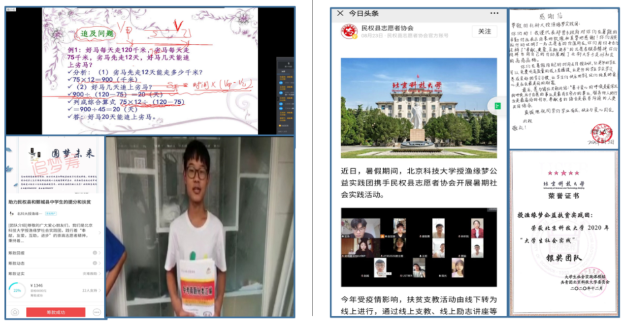 在帮助家乡学弟学妹的同时,赵世振发现个人的力量终究还是十分有限的,但他身后是北科,一直致力公益,助力乡村的北科。他多次将北科的丰富的公益实践活动带到家乡,搭起了北科助力乡村的桥梁!曾在暑期实践期间以实践团队长身份,带领团队在家乡地区进行线上支教、举办励志讲座、组织募捐并作为唯一线下实践人员实现了24个贫困孩子的小愿望,此举得到了当地乡镇政府的高度赞扬并赠予了一封手写信以表感谢、县级志愿者协会对他们的事迹进行了报道,实践结束后他所带领的团队获得银奖。