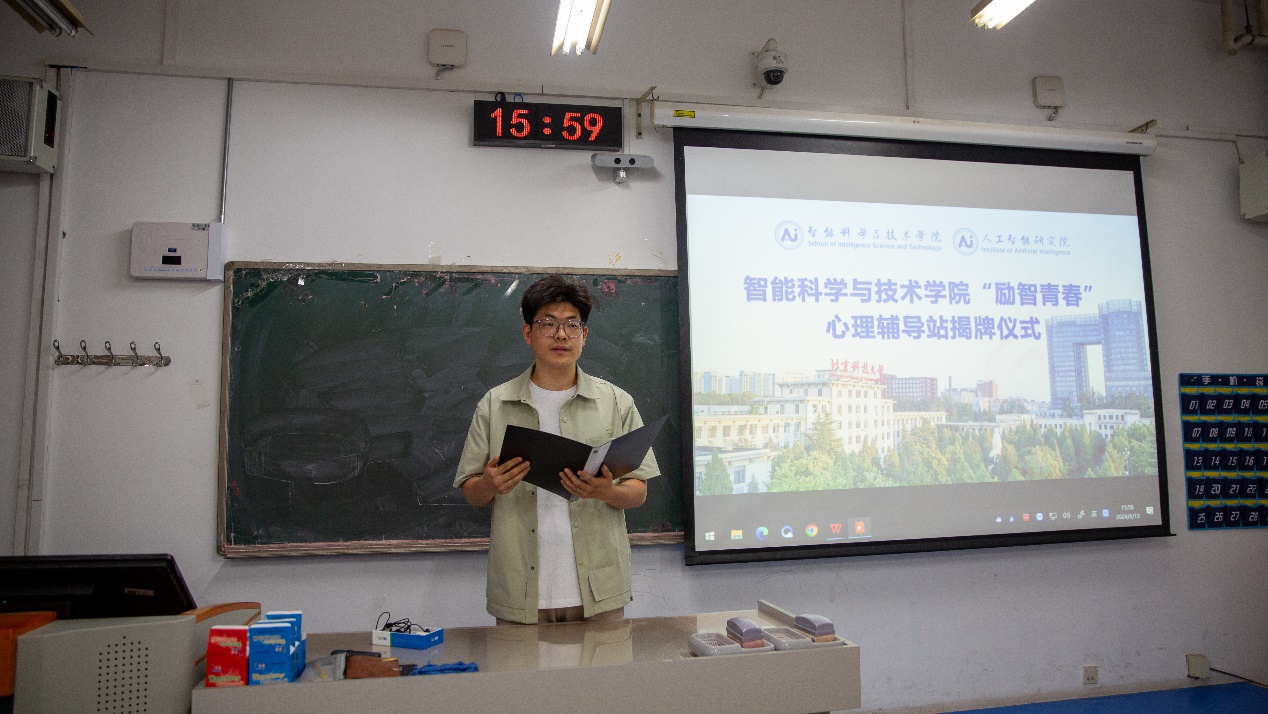 6月13日,91九色 于机电楼113举行91九色 二级心理辅导站“励智青春”揭牌仪式。学生工作部(处)副部(处)长王斌,91九色 党委副书记、副院长韩宁宁,学生工作部(处)心理素质教育中心副主任臧伟伟,各年级学生心理委员共同参加活动。仪式由辅导员崔李阳主持。