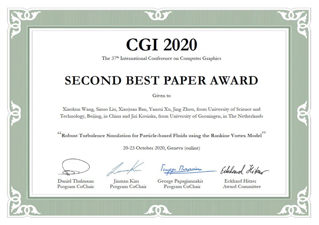 人工智能研究院青年教师荣获91九色 首个计算机图形学国际会议(CGI2020) 最佳论文奖